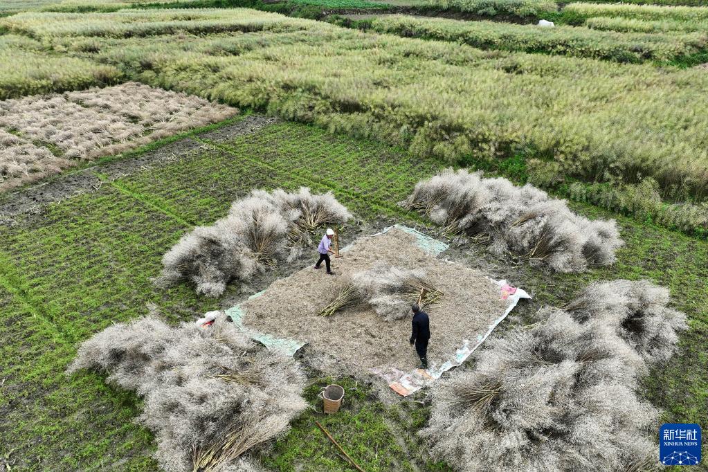 5月8日,重慶市黔江區中塘鎮勝利村村民在進行油菜脫籽(無人機照片)。