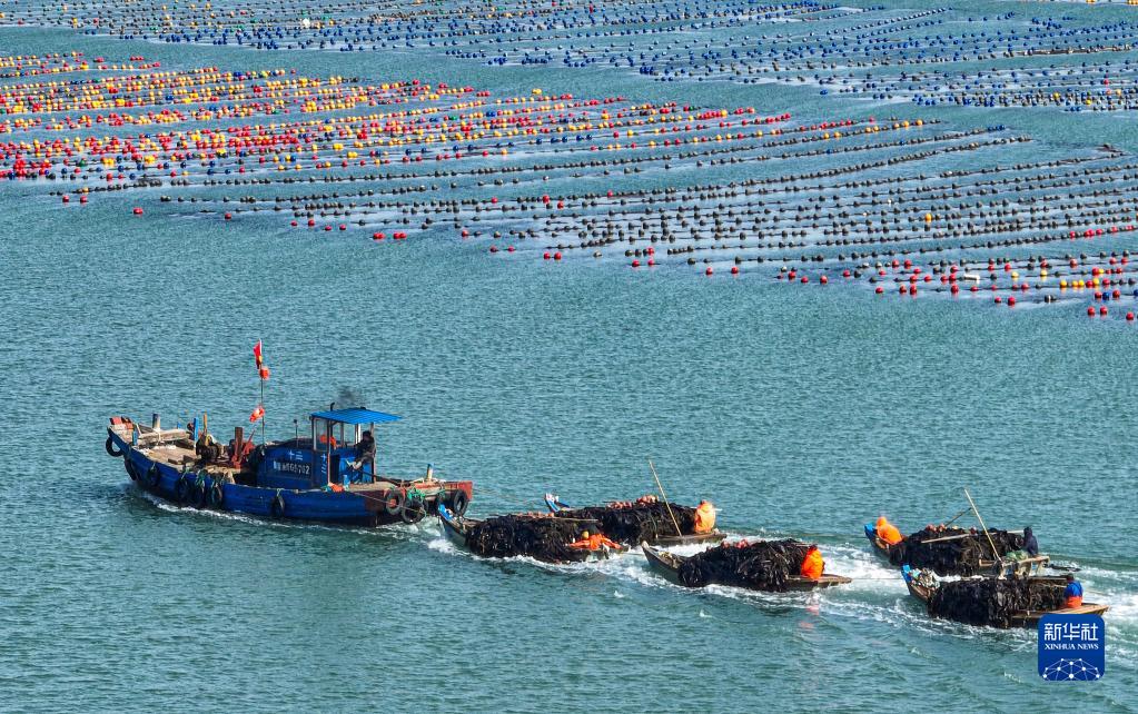 5月8日,在山東省榮成市愛倫灣海域海帶養殖區,漁民駕駛滿載海帶的漁船駛回碼頭(無人機照片)。