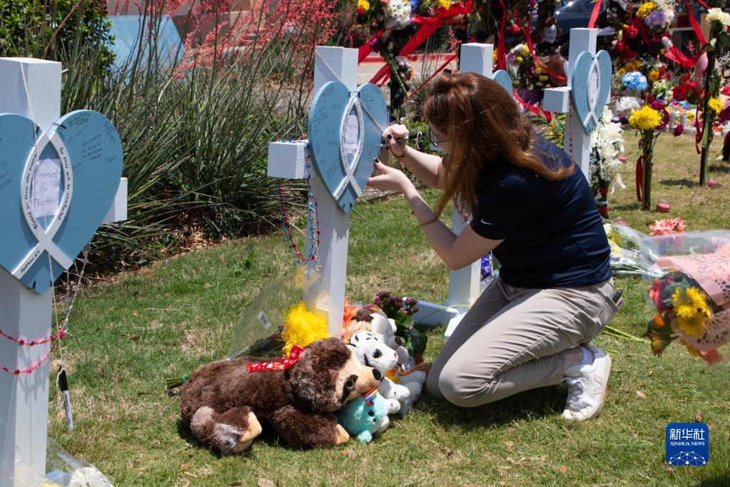 5月8日,在美國得克薩斯州達拉斯以北城鎮艾倫的購物中心槍擊事件現場附近,一名女子在受害者紀念板上寫下哀思。