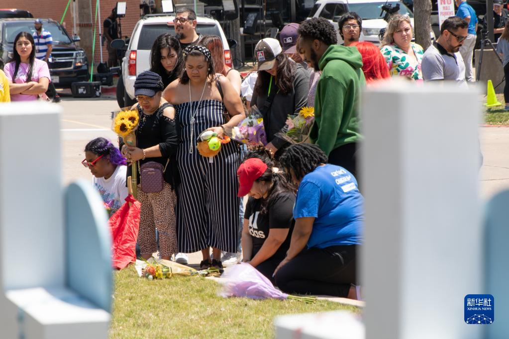 5月8日,在美國得克薩斯州達拉斯以北城鎮艾倫,人們在購物中心槍擊事件現場附近悼念受害者。