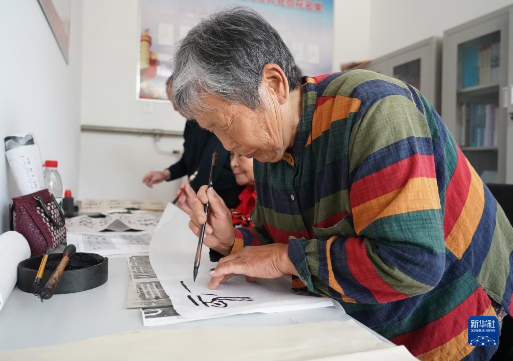 5月9日,老人在北京市平谷區西樊各莊村“養老驛站”練習書法。