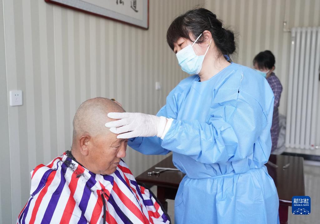 5月9日,在北京市平谷區西樊各莊村“養老驛站”,工作人員為老人理發。