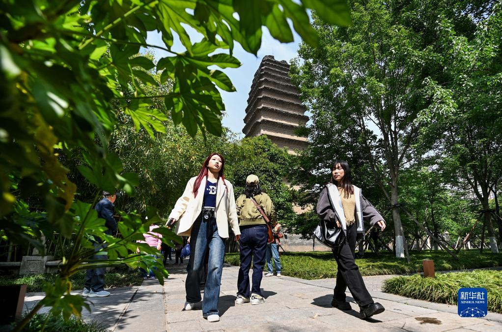 游客在西安薦福寺內參觀游覽(5月8日攝)。