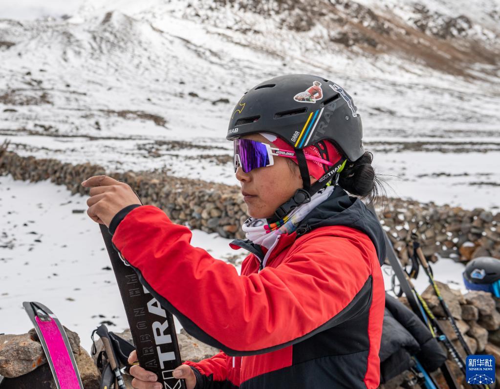 在西藏拉薩市當雄縣羊八井鎮,玉珍拉姆在訓練前為雪板粘貼止滑帶(5月2日攝)。新華社記者 孫非 攝