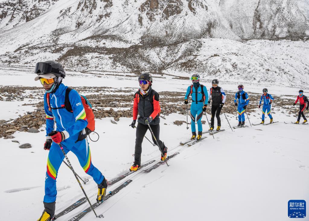 在西藏拉薩市當雄縣羊八井鎮,玉珍拉姆(左二)和隊友進行滑雪登山訓練(5月2日攝)。新華社記者 孫非 攝