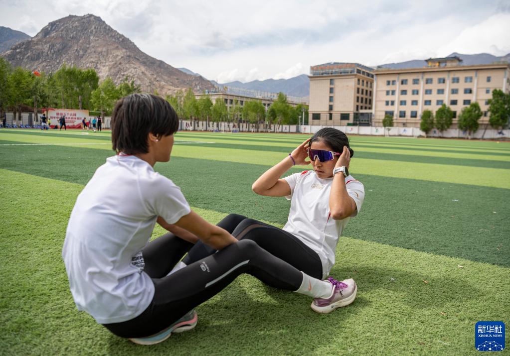 在西藏自治區體育運動技術學校,玉珍拉姆(右)在訓練中做仰臥起坐(4月29日攝)。新華社記者 孫非 攝