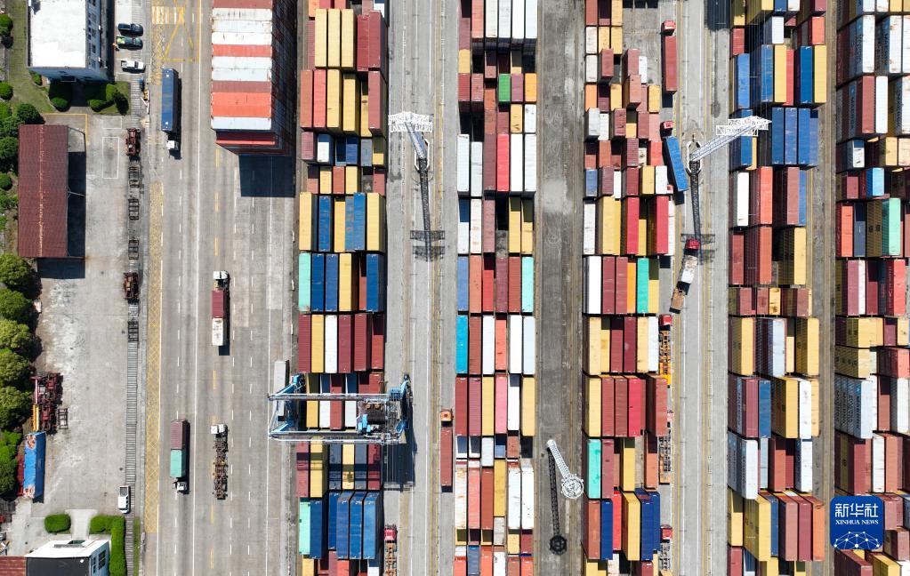 5月9日,卡車在寧波舟山港穿山港區運輸集裝箱貨物(無人機照片)。