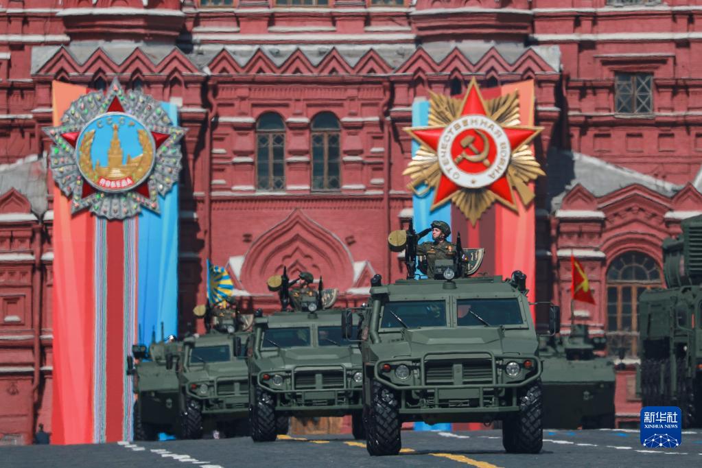 5月9日,在俄羅斯首都莫斯科,軍車編隊駛過紅場。