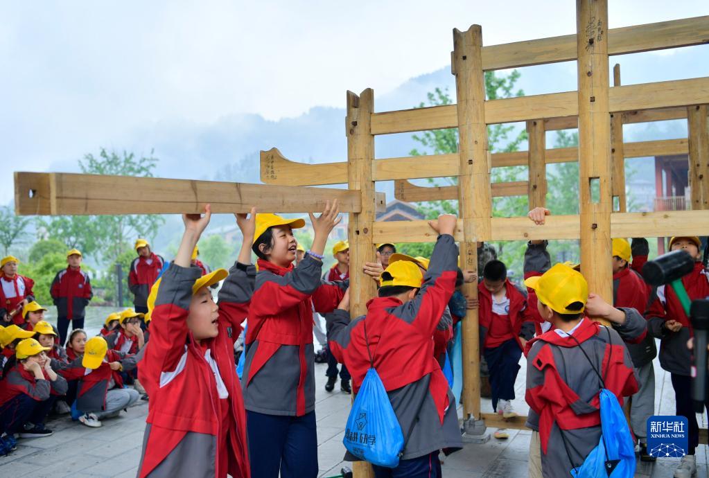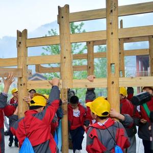 5月9日,宣恩縣第三民族實驗小學的學生在彭家寨參與“營造吊腳樓”體驗活動。