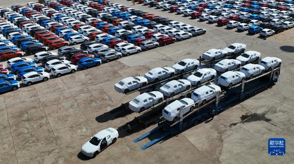 5月9日,在江蘇連云港港,大批商品車集結碼頭等待裝船(無人機照片)。