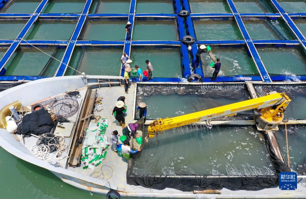 5月9日,在福建寧德三都澳東沖口海域,養殖戶從活水運輸船上過駁大黃魚魚苗,投放至養殖漁排(無人機照片)。