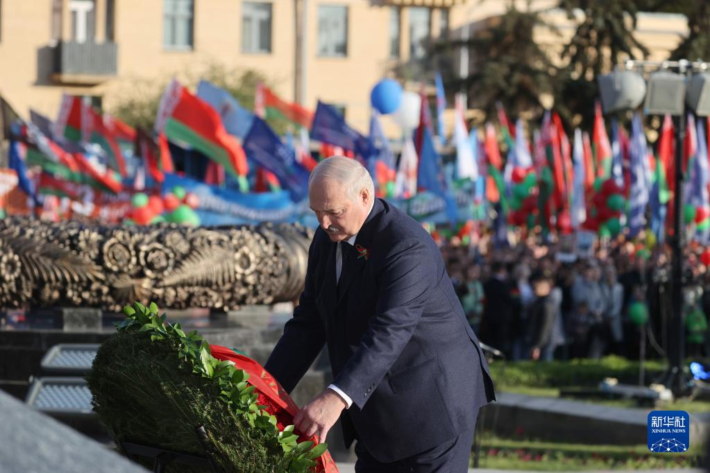 5月9日,白俄羅斯總統盧卡申科在明斯克的勝利廣場向勝利紀念碑獻花。