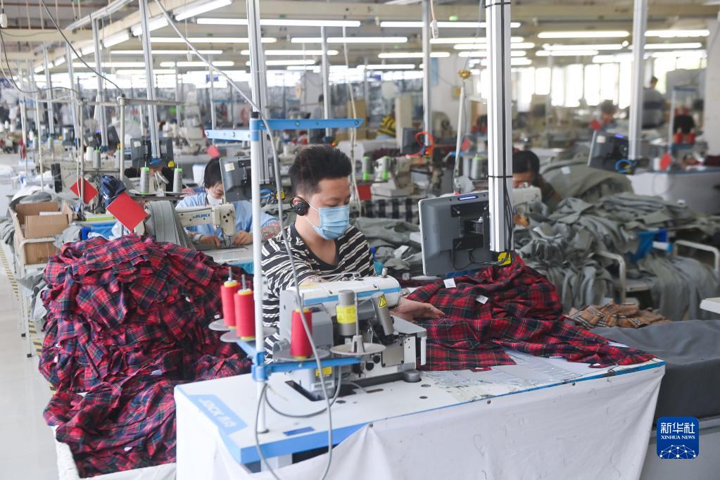 5月10日,在位于湖州市吳興區織里鎮的弗蘭尼爾(湖州)服飾有限公司生產車間內,工人在流水線上生產童裝。