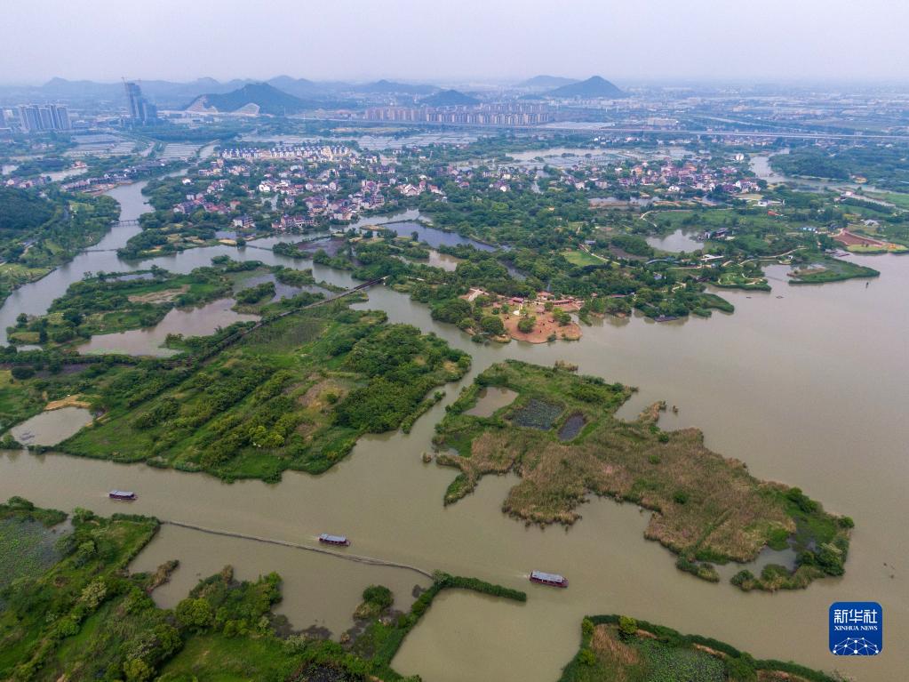 空中俯瞰位于德清縣的下渚湖國家濕地公園(5月8日攝,無人機照片)。下渚湖國家濕地公園面積約為36平方公里,是國家AAAA級景區、省級風景名勝區、朱鹮易地保護暨浙江種群重建基地、國家野生大豆保護區、省級生態旅游示范區試點單位。
