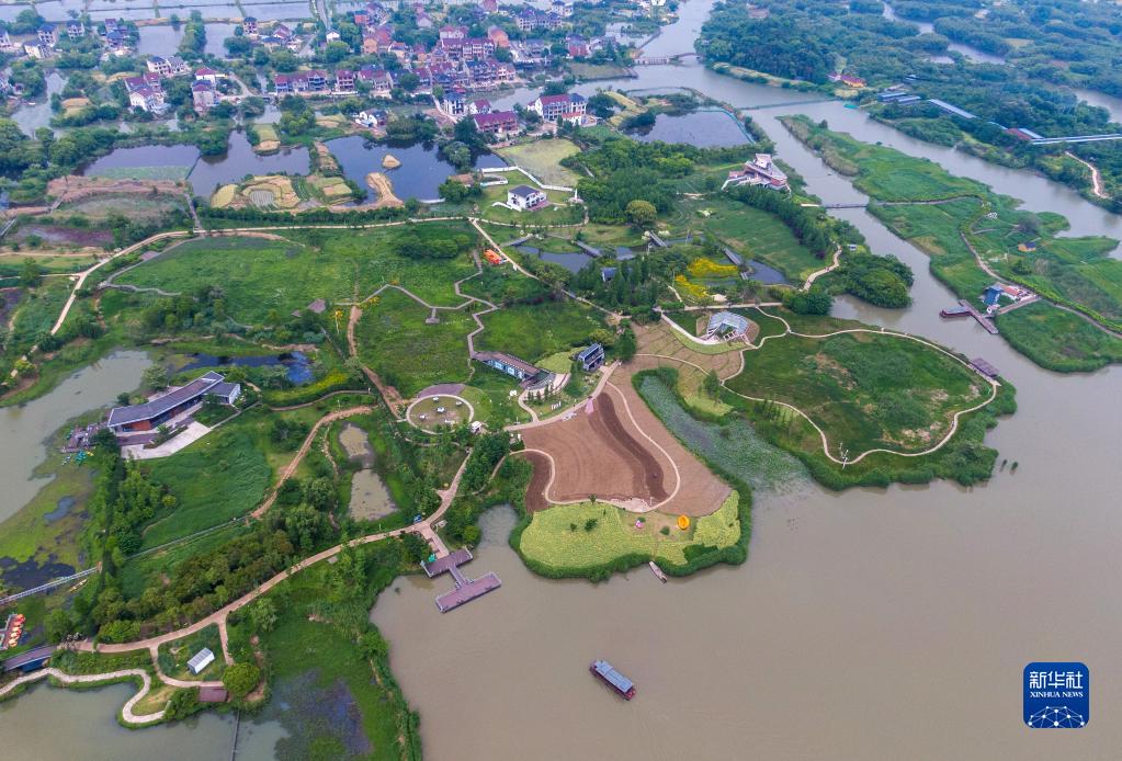 空中俯瞰位于德清縣的下渚湖國家濕地公園(5月8日攝,無人機照片)。下渚湖國家濕地公園面積約為36平方公里,是國家AAAA級景區、省級風景名勝區、朱鹮易地保護暨浙江種群重建基地、國家野生大豆保護區、省級生態旅游示范區試點單位。