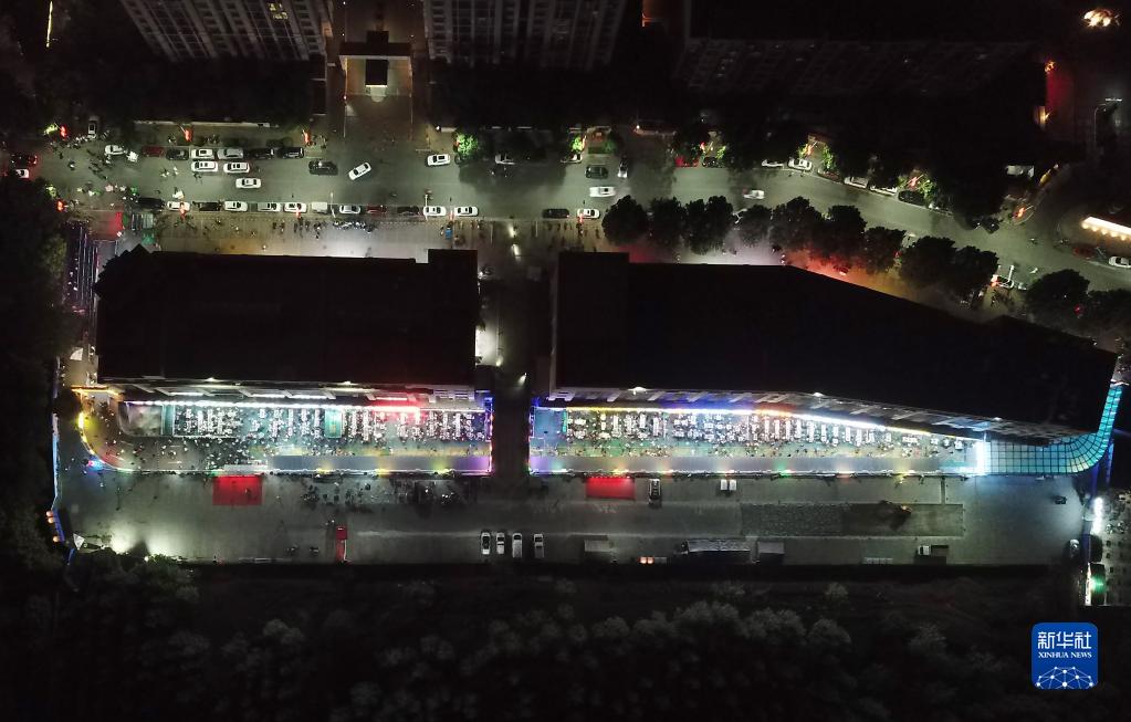 在淄博市張店區林澤街,眾多食客在品嘗燒烤(5月8日攝,無人機照片)。