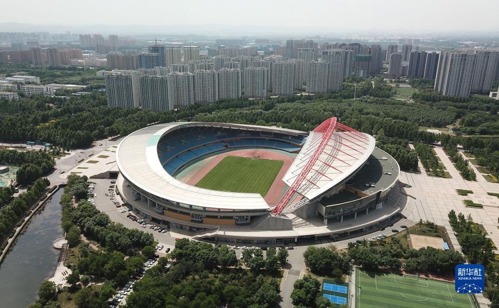 位于淄博市張店區的淄博市體育中心體育場(5月8日攝,無人機照片)。