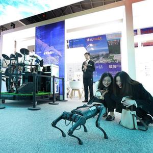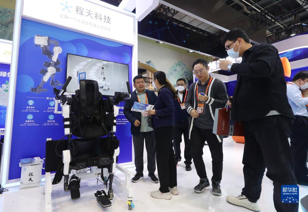5月10日,在浙江省品牌推介展臺上,參觀者在一個下肢外骨骼步行康復器旁交流討論。