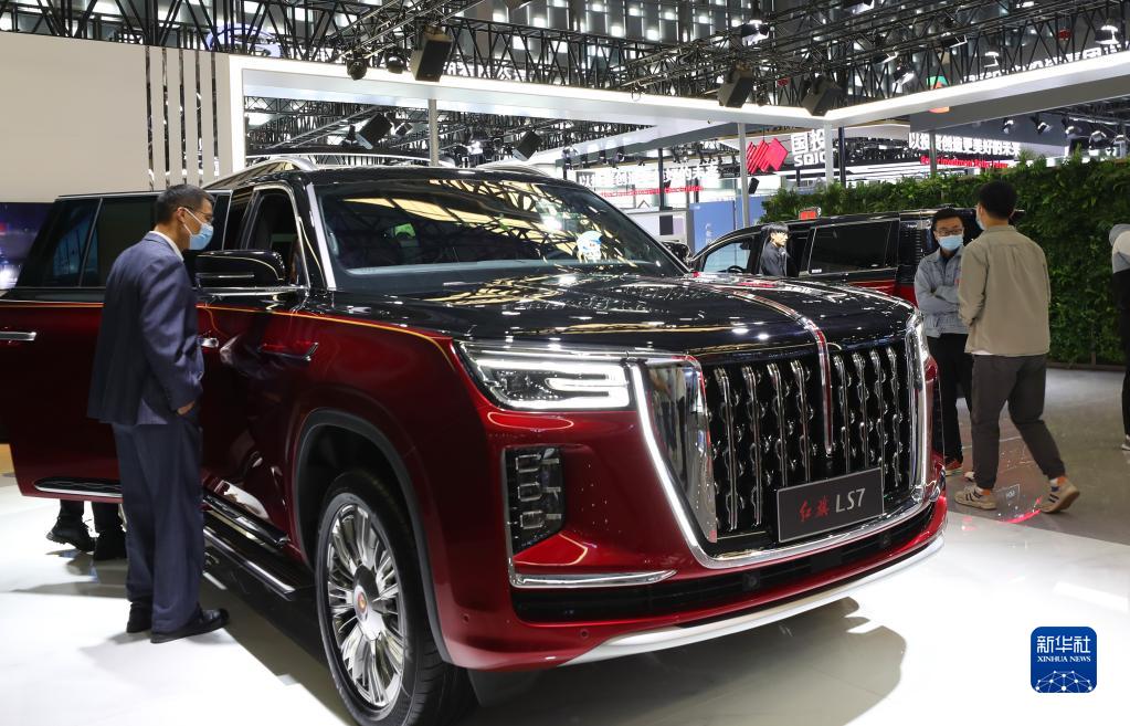 5月10日,參觀者在紅旗汽車展臺上的一輛紅旗LS7汽車旁駐足觀看。