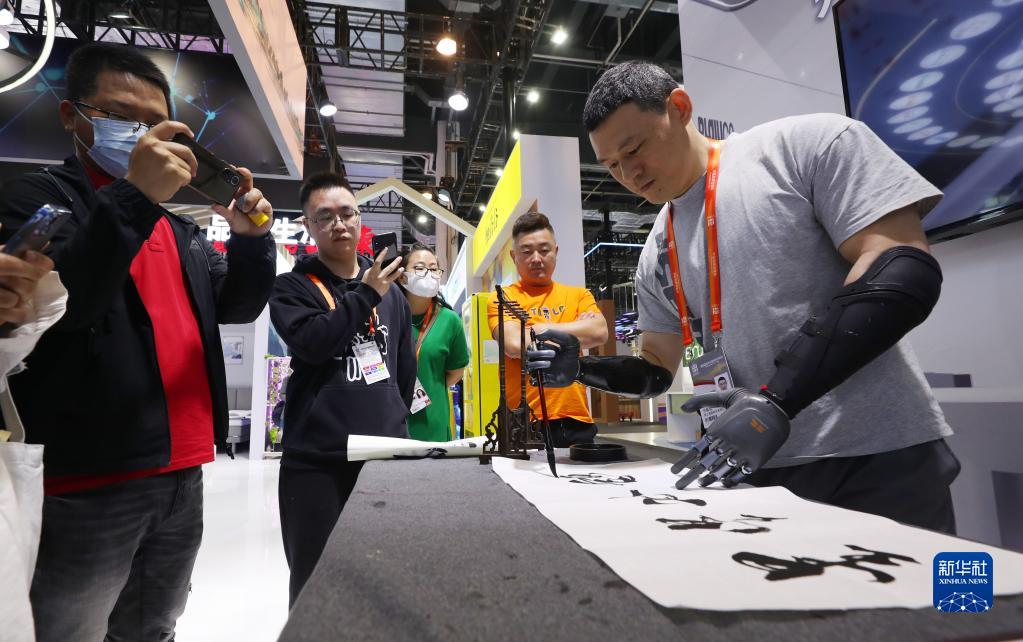 5月10日,在浙江省品牌推介展臺上,一名工作人員展示采用腦機科技操控的假肢寫書法。