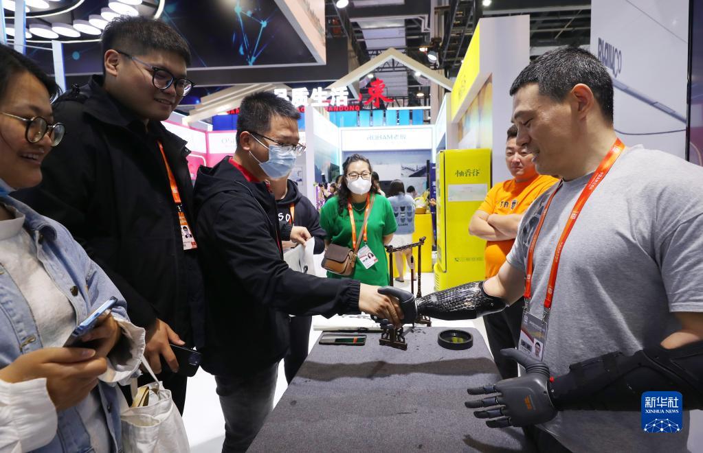 5月10日,在浙江省品牌推介展臺上,參觀者與安裝腦機科技操控假肢的工作人員握手。