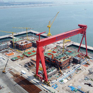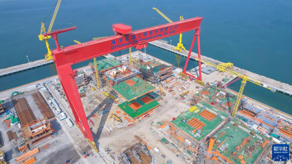 在海油工程天津智能化制造基地,渤中19-6凝析氣田一期開發項目WHPM平臺最后一片甲板片正在吊裝作業(5月8日攝,無人機照片)。