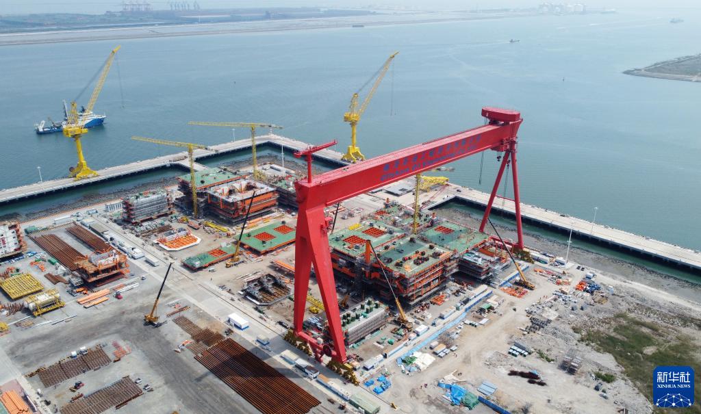 5月10日拍攝的渤中19-6凝析氣田一期開發項目平臺建造現場(無人機照片)。
