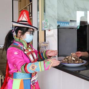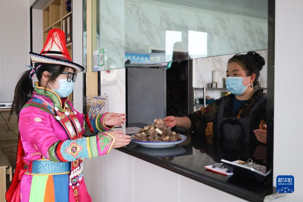 5月9日,在甘肅省張掖市肅南裕固族自治縣大河鄉西岔河村,裕固族村民在自家牧家樂為客人上菜。