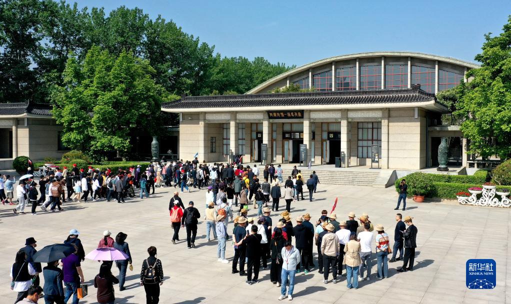 游客前往秦兵馬俑一號坑遺址參觀(4月26日攝,無人機照片)。