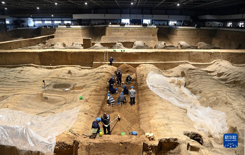 工作人員在秦兵馬俑二號坑遺址進行發掘工作(4月26日攝)。