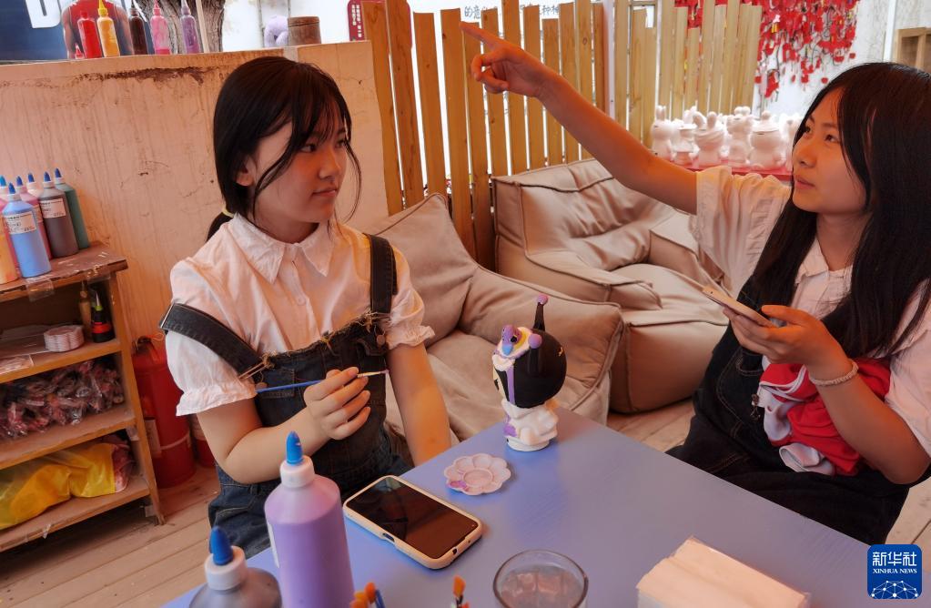5月10日,兩名年輕人在山東濟寧環西北里文創街區體驗手工項目。