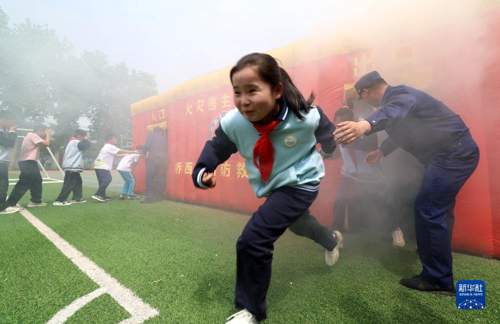 5月10日,消防員組織石家莊市橋西區城角街小學的學生們進行火災逃生模擬演練。