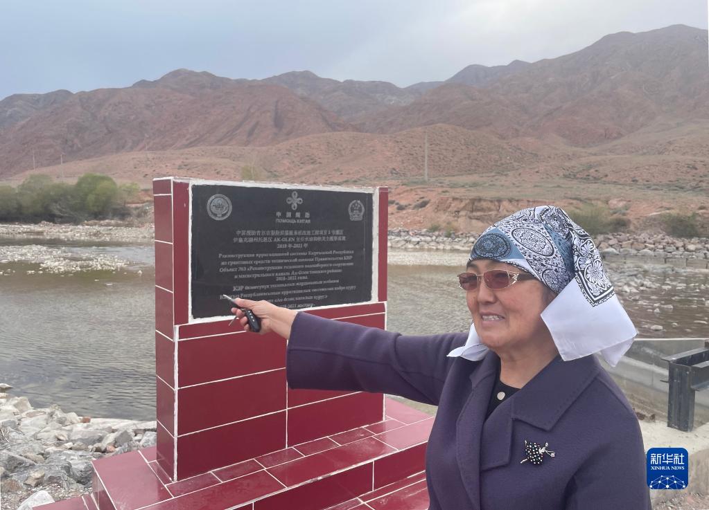 4月25日,在吉爾吉斯斯坦阿克奧隆村,阿克奧隆村前村委會主任瑪伊拉姆·卡迪拉列娃站在中國援吉灌溉系統改造工程的紀念碑旁。