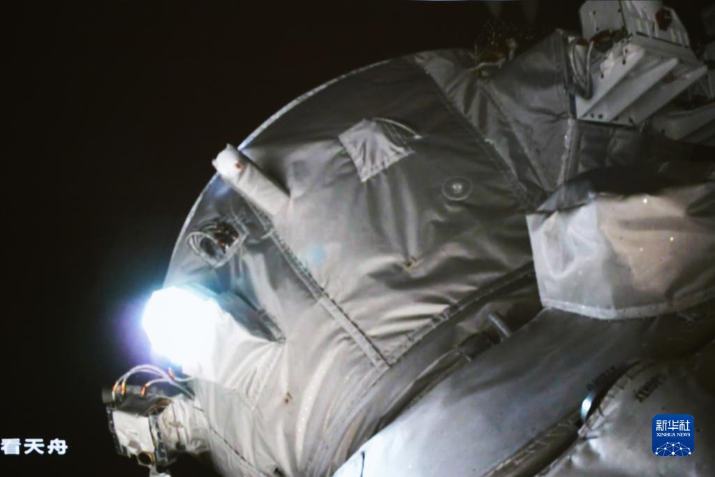 5月11日在北京航天飛行控制中心拍攝的天舟六號貨運飛船與空間站組合體完成交會對接的畫面。