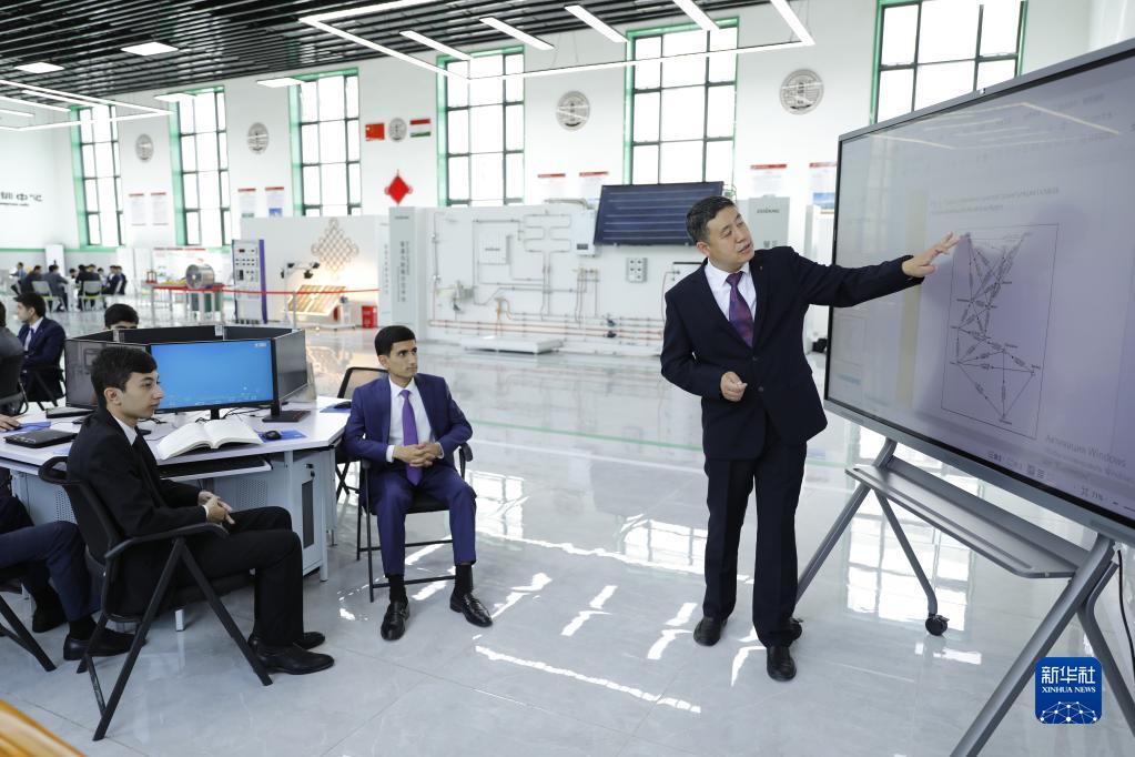4月12日,在塔吉克斯坦首都杜尚別的魯班工坊內,來自天津城市建設管理職業技術學院的老師吳正鵬(右一)向學生講解測繪實踐知識。