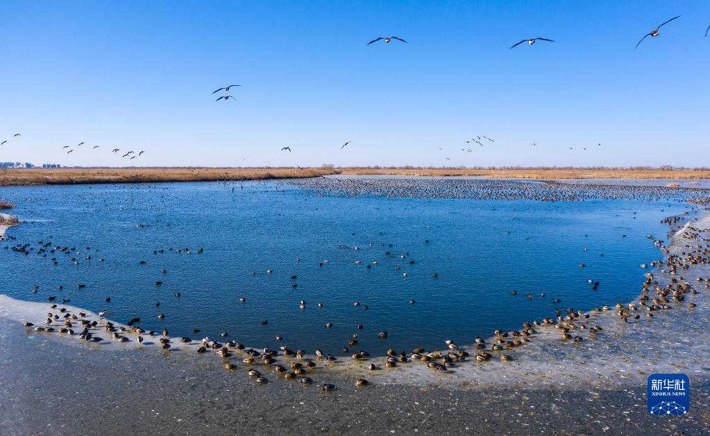 這是鳥類在中國河北省衡水湖棲息的資料照片(2022年12月22日攝,無人機照片)。