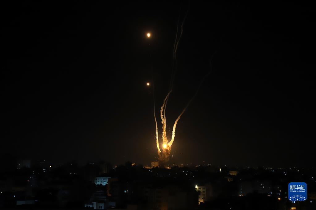 這是5月10日在加沙城拍攝的從加沙地帶射向以色列的火箭彈。