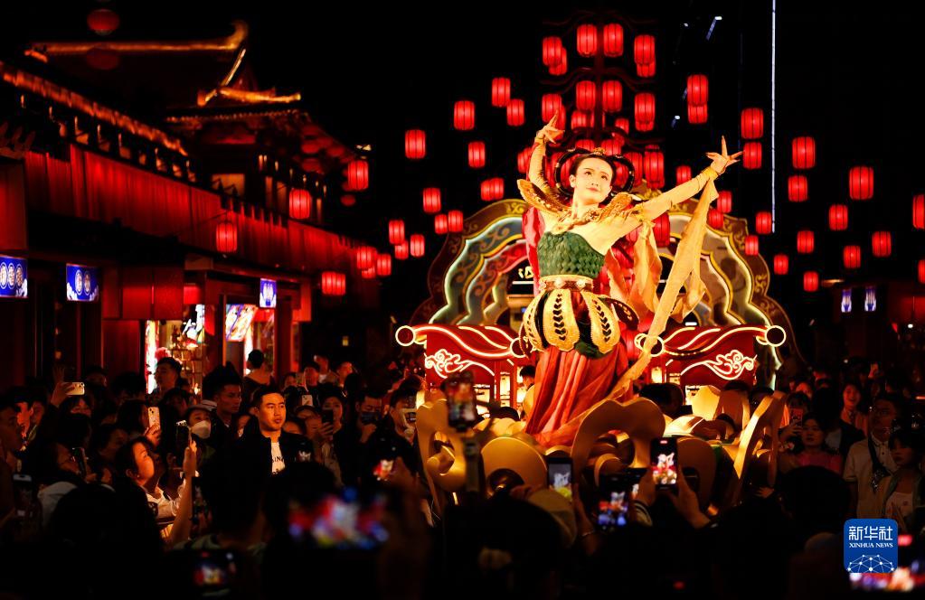 游客在西安大唐不夜城觀看演出“旋轉的胡旋”(5月8日攝)。