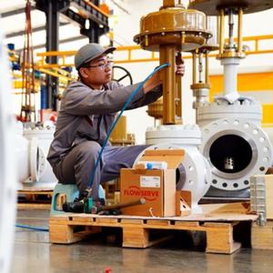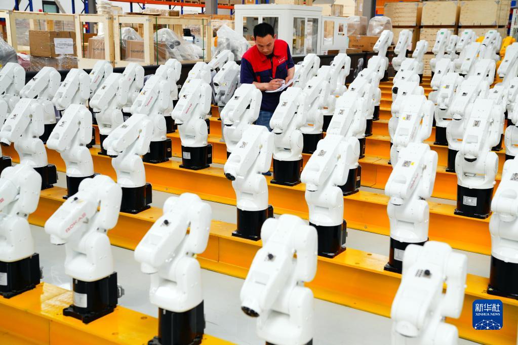 5月11日,在鄒城市機器人產業園,工作人員在質檢工業機器人。