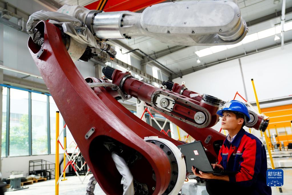 5月11日,在鄒城市機器人產業園,工作人員在生產調試工業機器人。