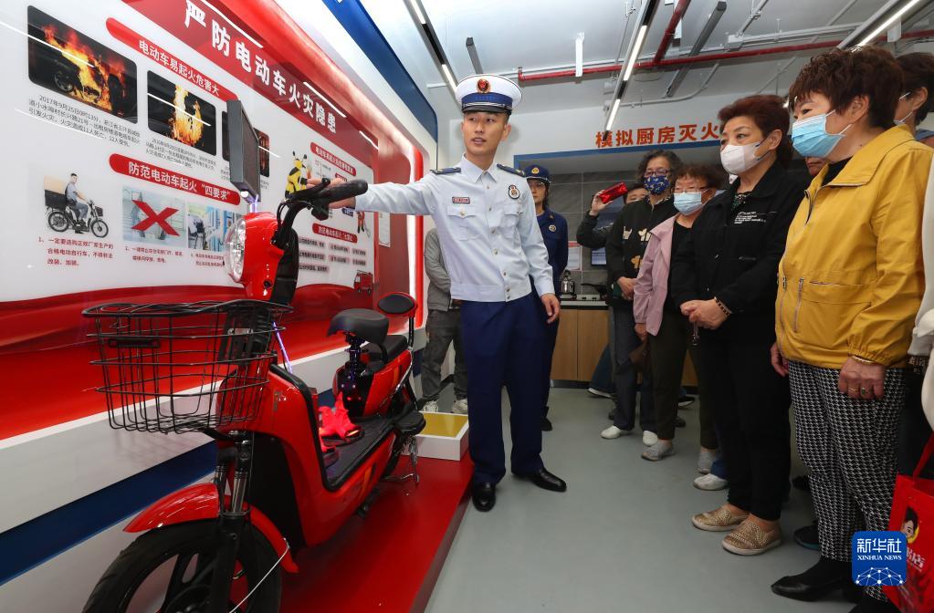 5月11日,長寧區消防救援支隊的消防員向社區居民講解電動車充電存在的火災風險。