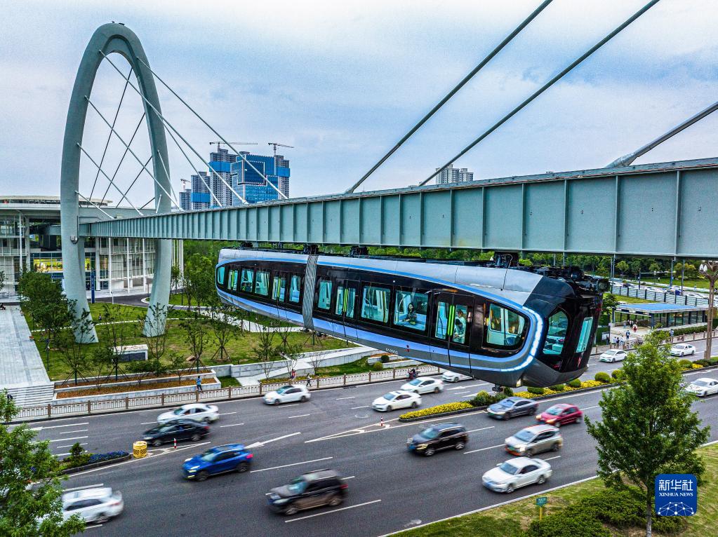 5月9日拍攝的武漢“光谷光子號”空軌列車(無人機照片)。