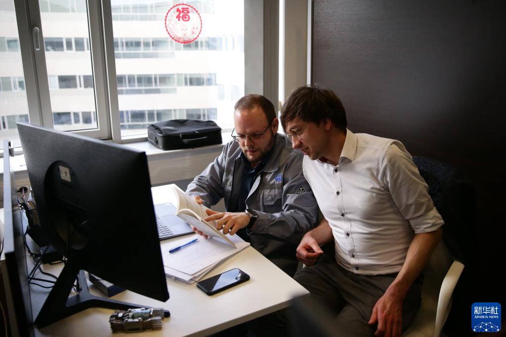 2月22日,鮑爾陶(左)在位于匈牙利布達佩斯的辦公室與同事交流。