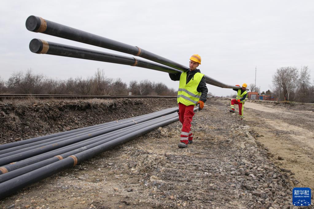 2月22日,工作人員在匈牙利索包德薩拉什的匈塞鐵路匈牙利段工地搬運電纜保護管。