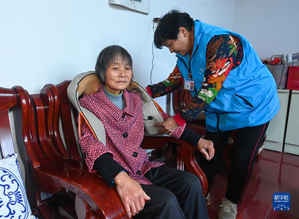 5月11日,在杭州市臨安區錦北街道龍馬村70歲的獨居老人郭香娣家里,助老員幫助老人使用按摩設備。郭香娣老人自從簽約了家庭養老床位服務,政府配套提供了緊急呼叫器、紅外人體感知報警器、門磁探測器、智慧床墊等智能化設備和助行椅、床邊桌等適老化設備。