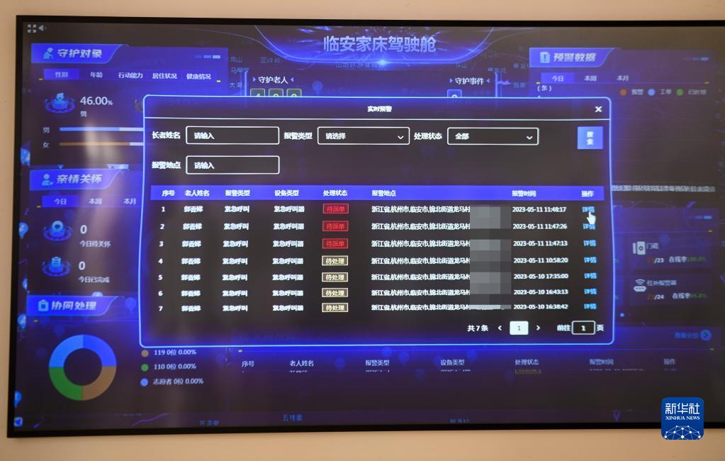 這是杭州市臨安區智慧養老服務中心的數字監管平臺上的臨安區各地家庭養老床位顯示的緊急呼叫情況,將會第一時間通知家屬或者助老員上門查看(5月11日攝)。