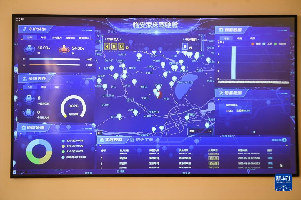 這是杭州市臨安區智慧養老服務中心的數字監管平臺上的臨安區各地家庭養老床位服務的實時數據(5月11日攝)。