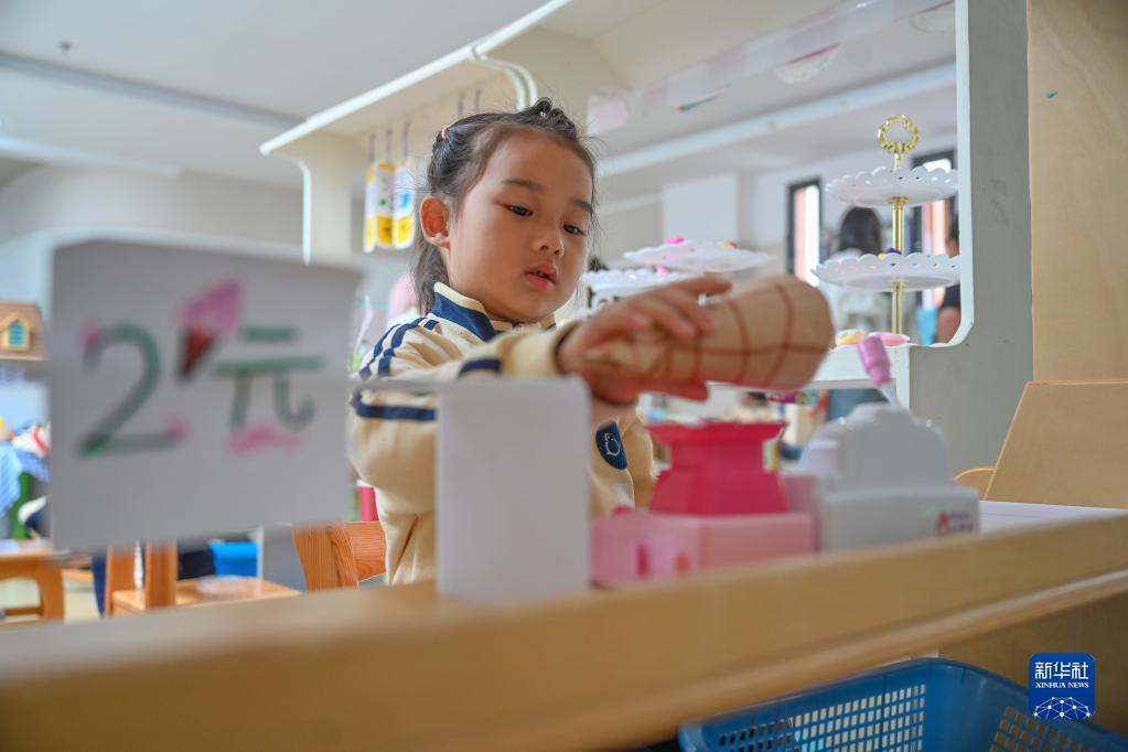 5月11日,在福建幼兒師范高等??茖W校附屬第一幼兒園,一名學前兒童在游園活動中模擬經營店鋪。
