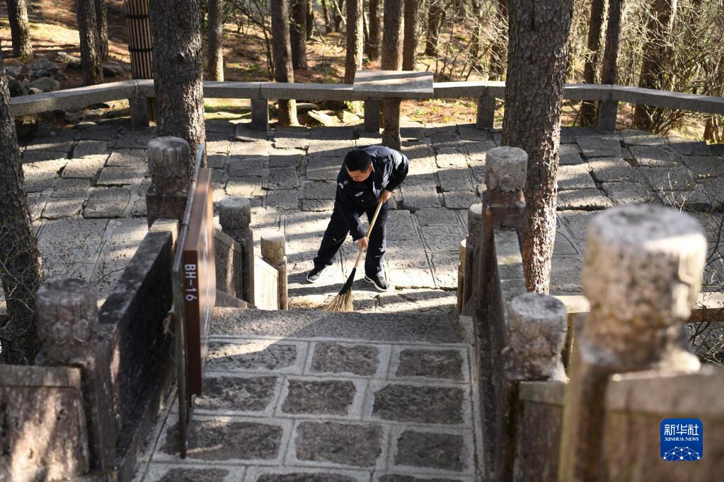4月21日,在黃山風景區平天矼瞭望哨門口,秦志平在打掃山道。