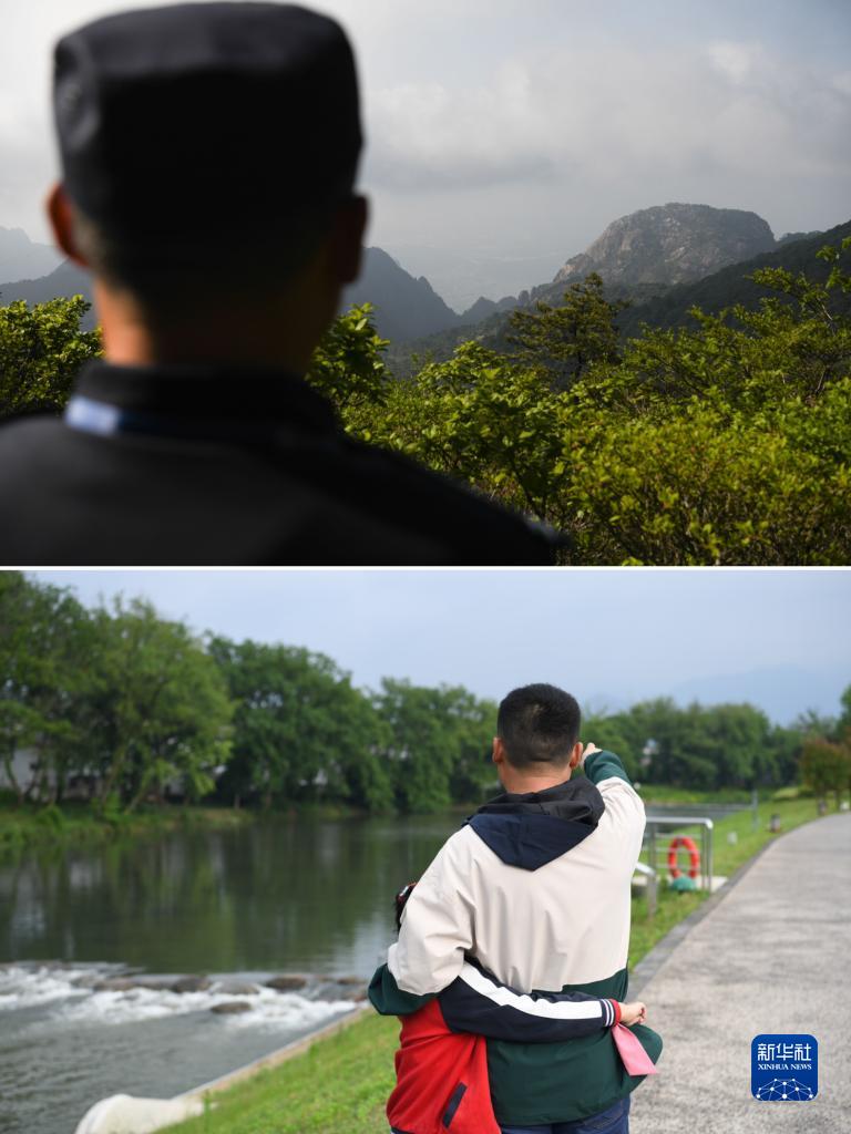 這是一張拼版照片。上圖:秦志平在黃山之巔俯視山腳,看向家的位置(5月8日攝);下圖:在安徽省黃山市黃山區,休假中的秦志平(右)和女兒秦靖妍散步途中,指著黃山的方向,告訴女兒自己守護山林的故事(5月7日攝)。